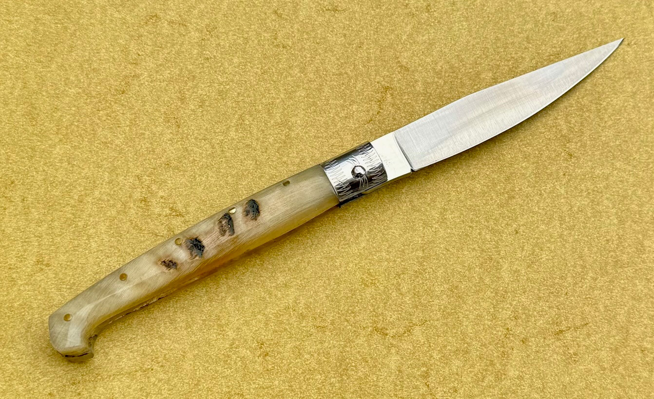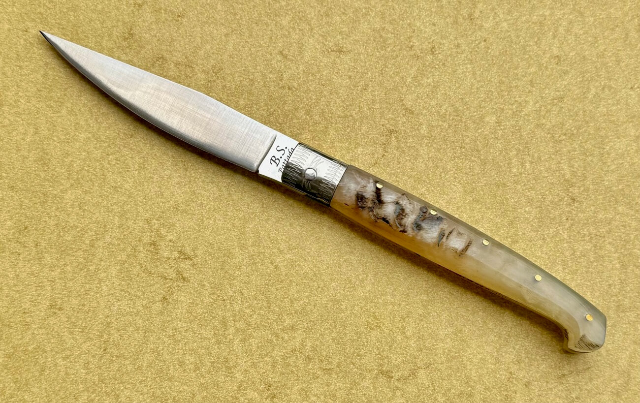 Couteau de Stefano Bellu, modèle Pattada corne mouton. Lame de 9.2cm. en acier inox 420. Manche avec mitres d’une pièce en acier inox replié et plaquettes rivées en corne de mouton. Couteau à friction. Longueur totale 20.3cm. Fabriqué artisanalement en Sardaigne à Pattada. Livré avec une pochette de protection.