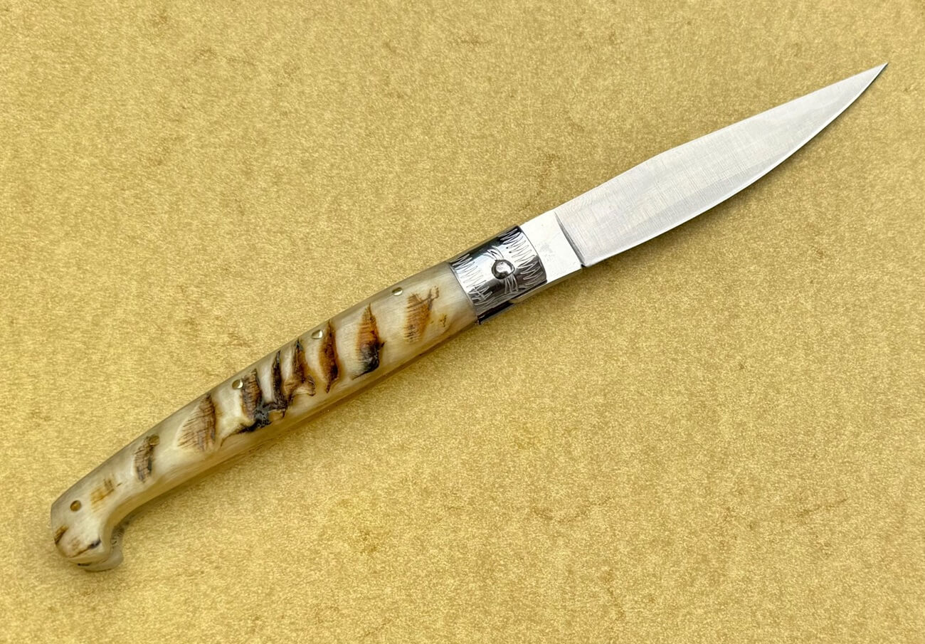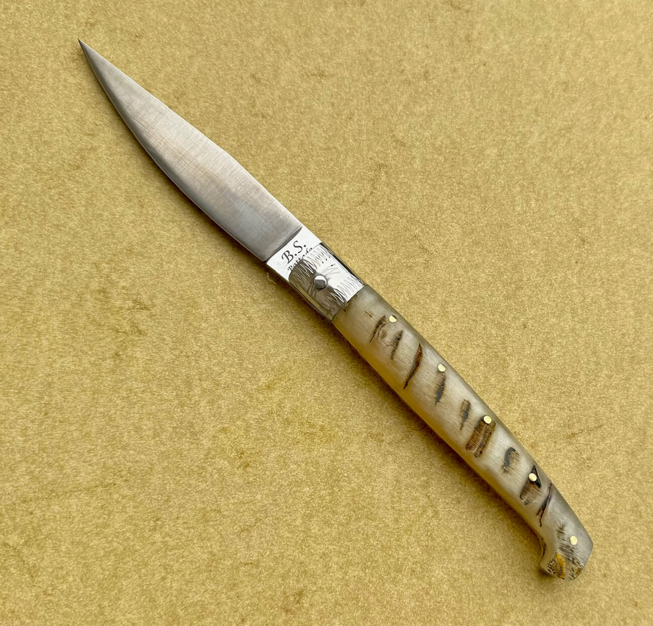 Couteau de Stefano Bellu, modèle Pattada corne mouton. Lame de 9.2cm. en acier inox 420. Manche avec mitres d’une pièce en acier inox replié et plaquettes rivées en corne de mouton. Couteau à friction. Longueur totale 20.3cm. Fabriqué artisanalement en Sardaigne à Pattada. Livré avec une pochette de protection.