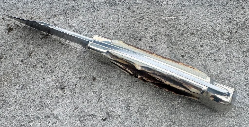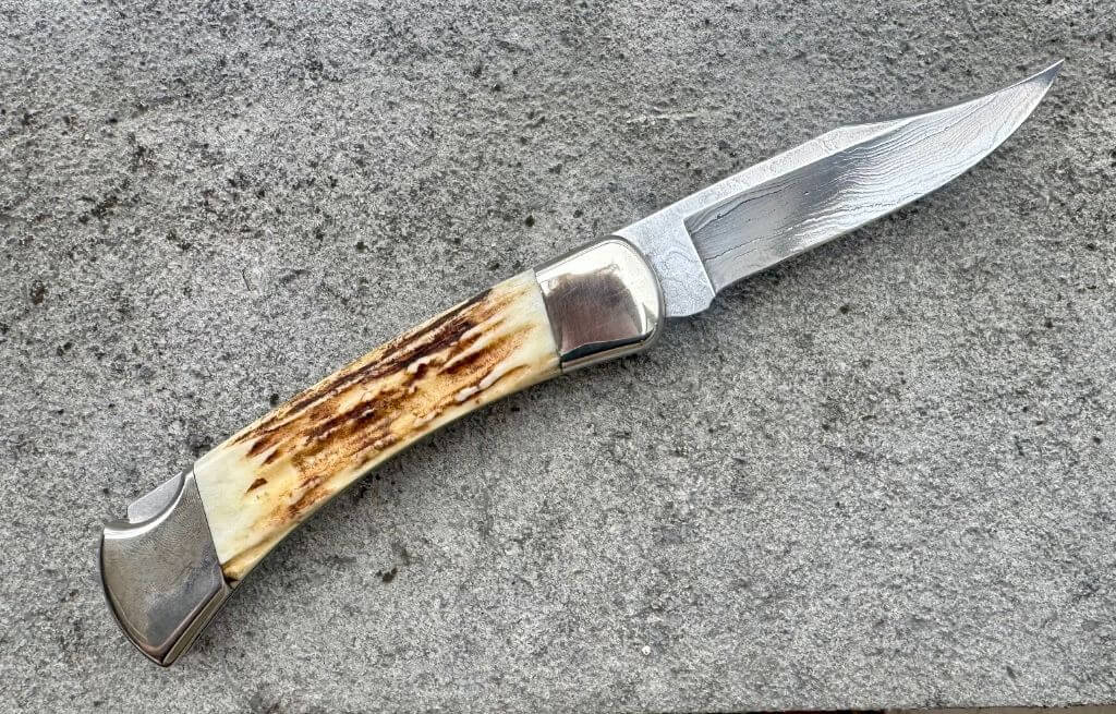 Buck 110 damas cerf. Lame de 9.4cm en acier damas steel. Manche avec plaquettes en bois de cerf, mitres en maillechort. Cran à pompe arrière. Longueur totale 22cm. Poids 218g. Livré en pochette zip. Un couteau légendaire qui a fait la réputation de la marque. Cette version est une rareté fabriquée à 500 exemplaires.
