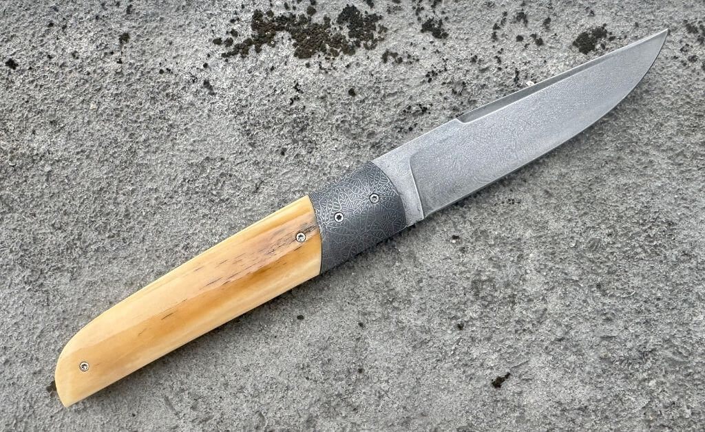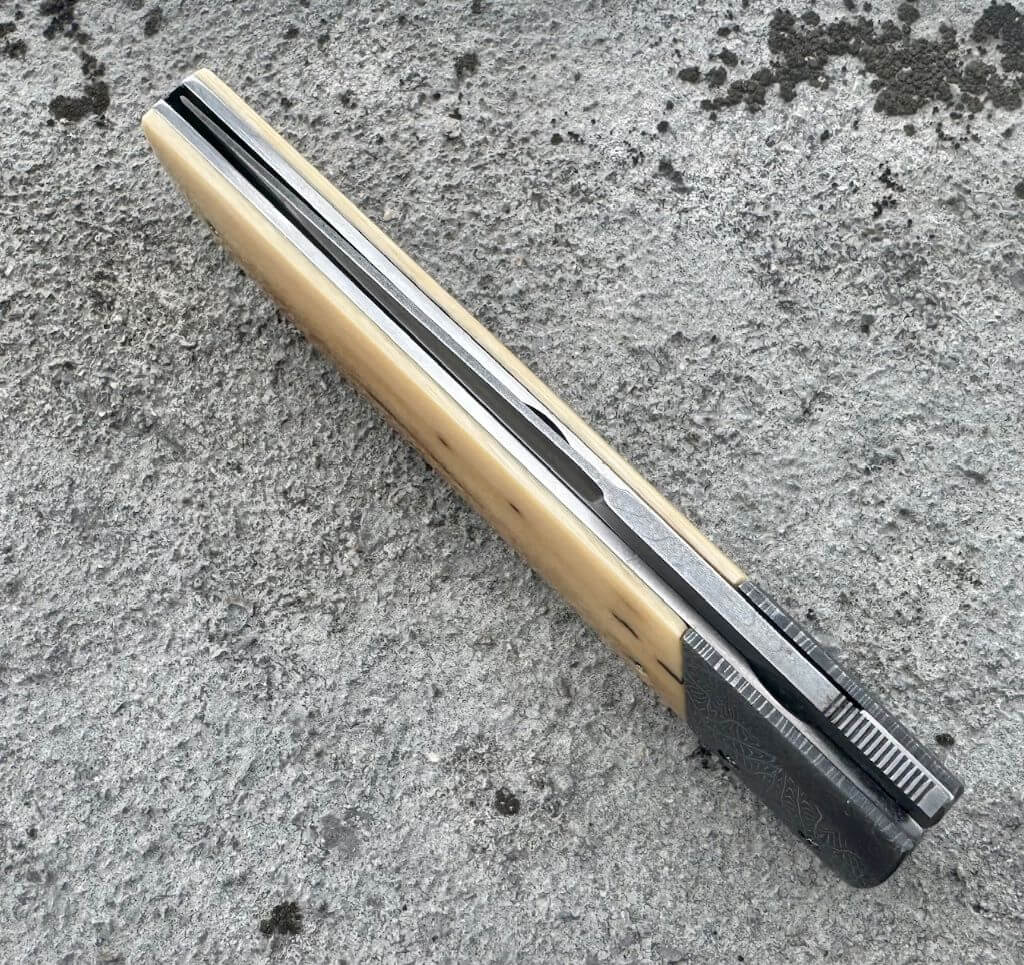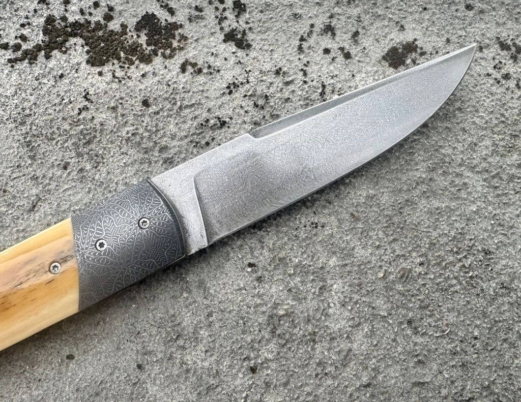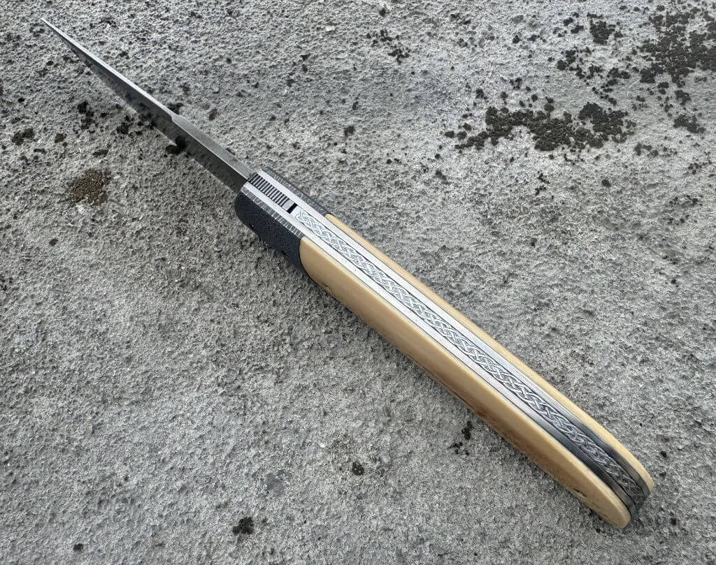 Couteau de Thierry Chevron, modèle Old school. Lame de 9.5cm en acier damas wootz avec faux contre-tranchant, ouverture par front flipper. Mitres en damas carbone. Plaquettes vissées en ivoire de mammouth. Platines titane Gr 5. Fausse pièce entièrement gravée à la main. Liner lock. Longueur ouvert 21cm. Poids 123 g.