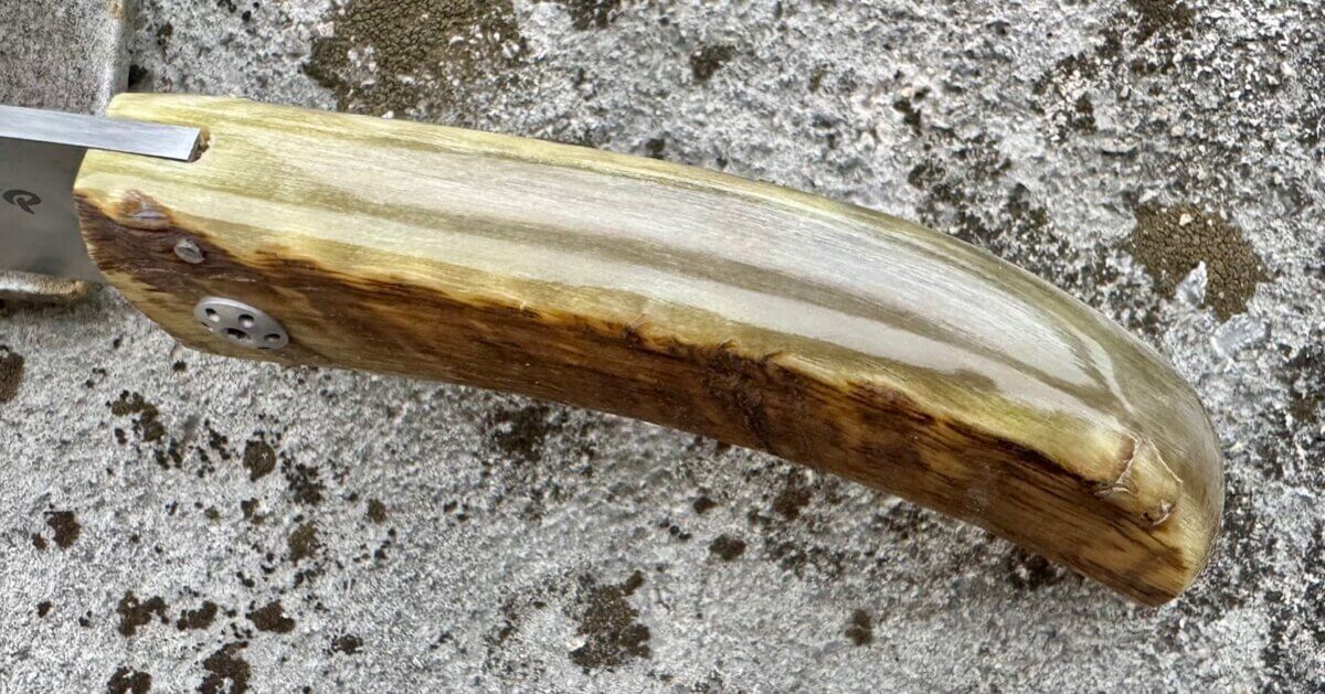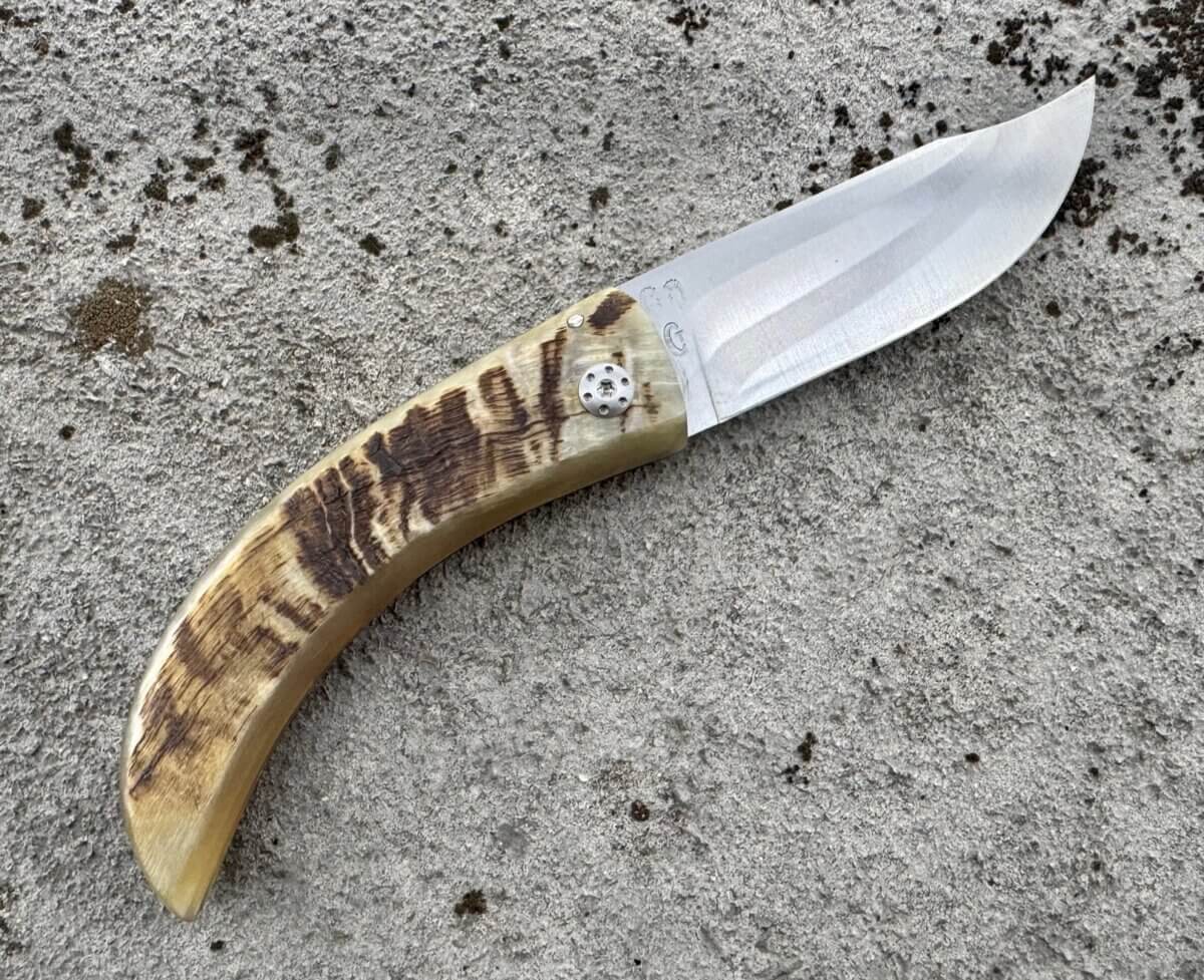 Coutellerie Panzani Curnicciolu bélier. Lame de 8,2cm en acier carbone C130 avec double trempe sélective révélée par microbillage, épaisseur 3mm, avec poinçonx FP (signature de l’artisan François Panzani), Ct (cultelia Tradiziuale) et tête de mouflon (Label qualité des couteliers corses). Plein manche en corne de bélier lisse pressée à leur atelier. Couteau à friction avec système à 2 clous (axe maté). Longueur 18.8cm. Couteau traditionnel fait à la main.