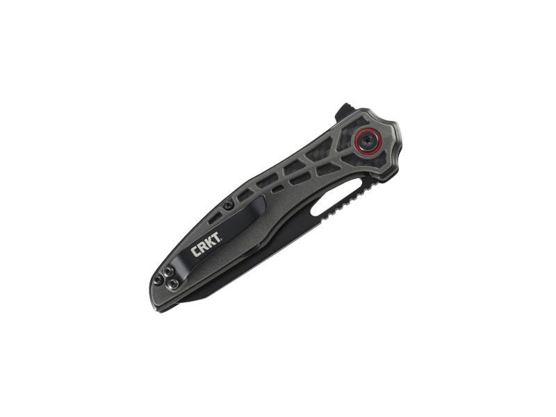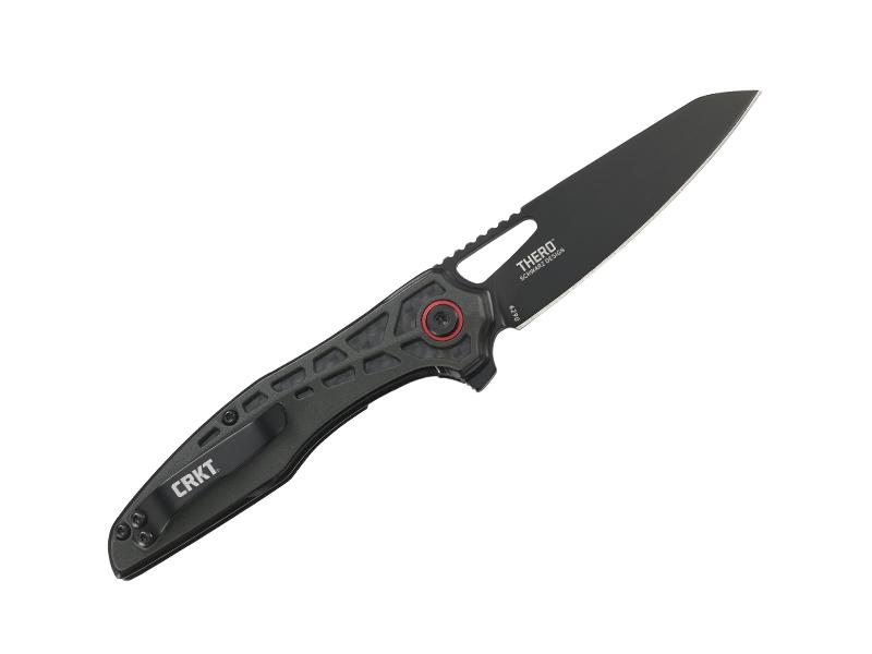 CRKT Thero 6290. Lame avec coating noir en acier inox acier 8Cr14MoV de 8cm  Ouverture ambidextre par flipper. Cran intérieur liner lock. Manche de 10,5 cm avec platines en fibre de carbone et plaquettes en nylon/fibre de verre noir. Pivot anodisé rouge. Clip. Poids 88g.