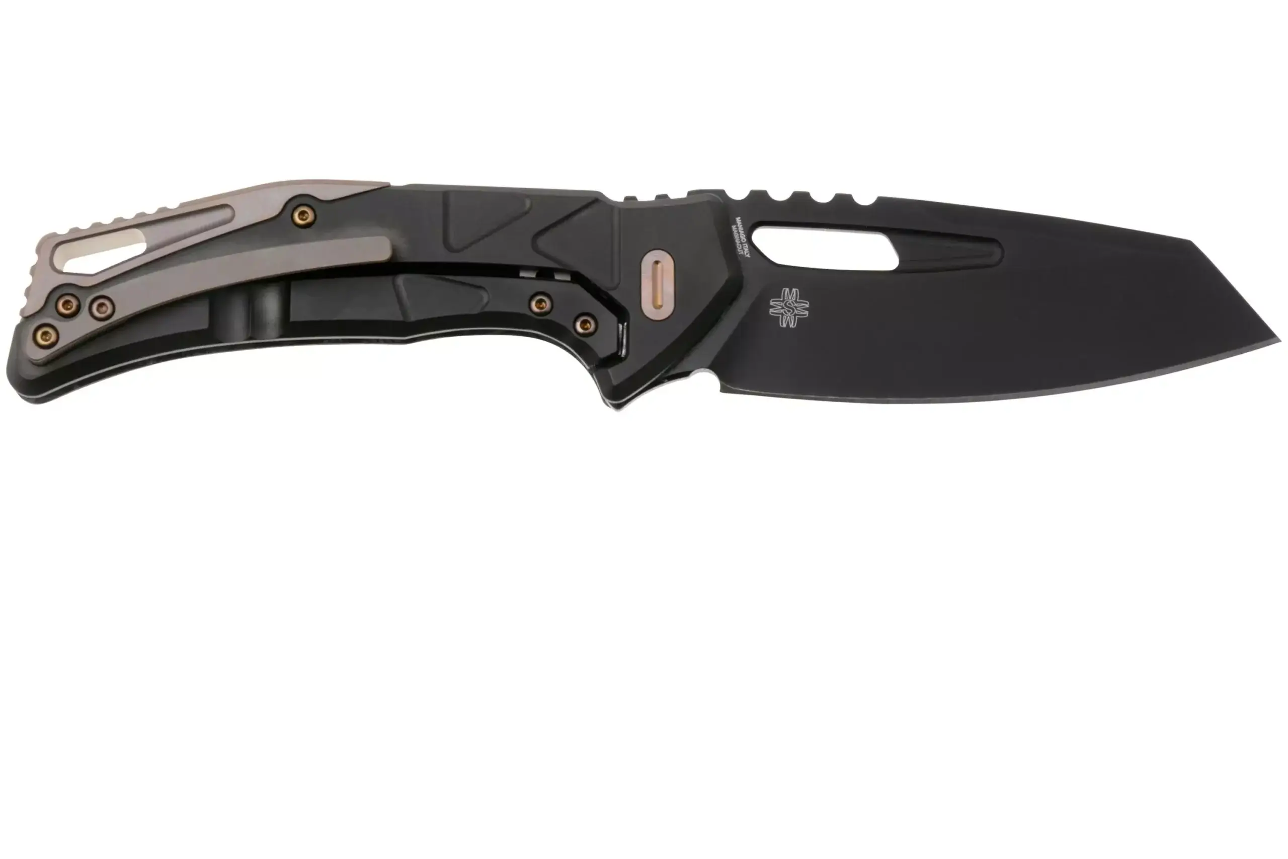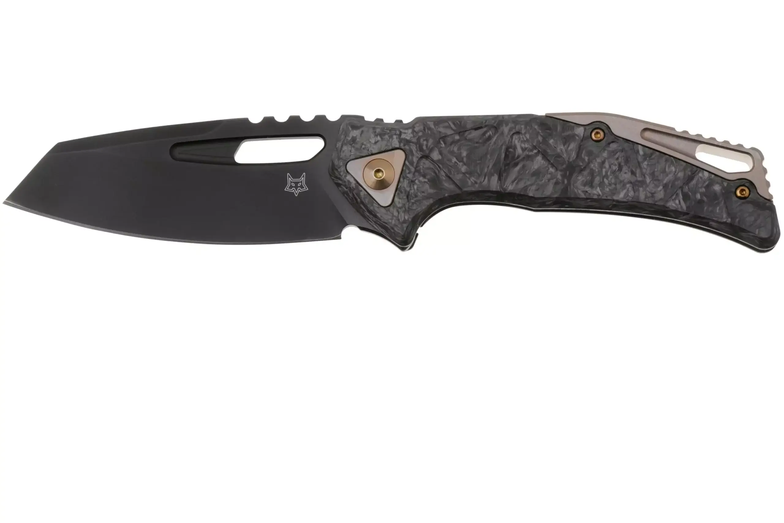 Fox Chronos Fx552ALFC carbone. Lame de 8.55cm en acier inox CPM Magnacut. Ouverture d’une main ambidextre par le trou de la lame ou par flipper. Manche en fibre de carbone Dark Matter côté recto et titane côté verso. Frame lock avec ajout d’acier sur le point de friction du talon de la lame. Clip en titane. Stefan Merk design. Longueur totale 20.1cm. Poids 130g. C’est un excellent couteau EDC de couleur noire/brune et d’une réalisation très soignée. Livré dans une pochette zip en nylon.