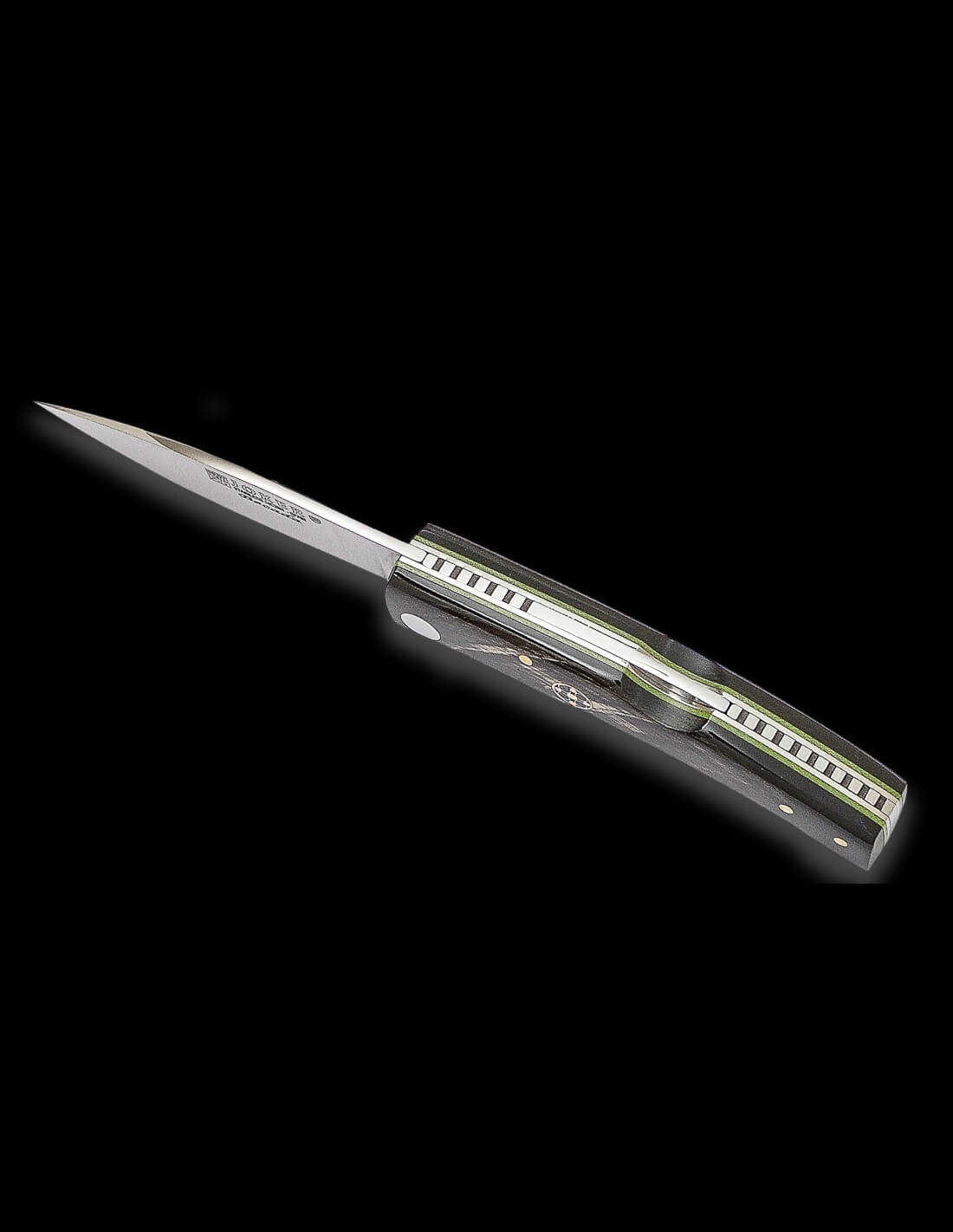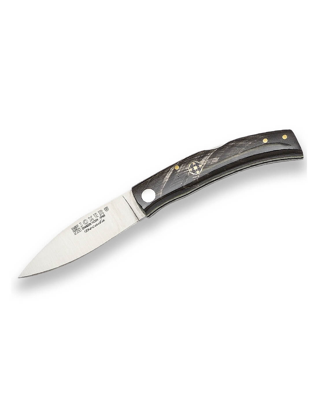 Lame de 8cm en acier inox mobylène vanadium. Plaquettes en corne avec insert rosace rivées sur des platines en inox guillochées. Cran à pompe. Longueur totale 18cm. Photo non contractuelle, les veines de la corne peuvent varier d’un couteau à l’autre