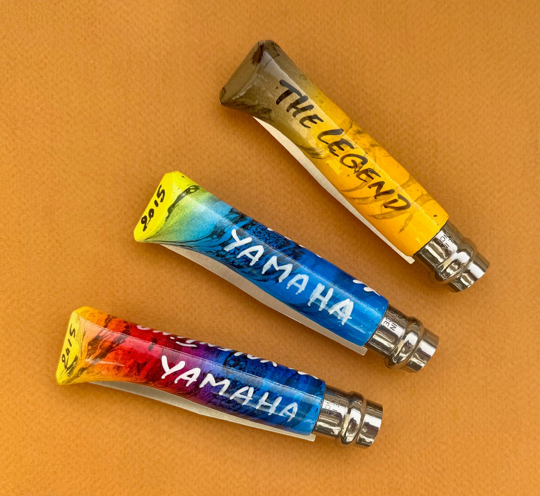 Opinel 8 Valentino Rossi. Lot de 3 opinels numéro 8, lame en inox. Manche personnalisé par Billon avec comme décor un hommage à Valentino Rossi, coureur moto multiple champion du monde dans diverses catégories. Signature et date de réalisation par l’artiste.