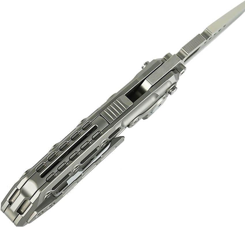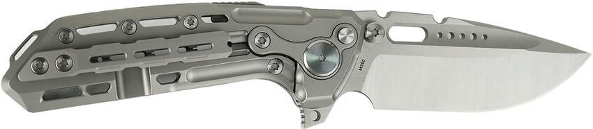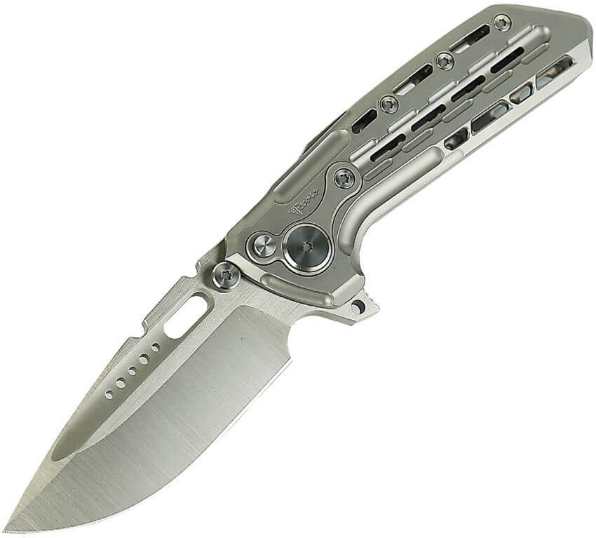 Reate Terminator TX228 BB. Lame de 9.6cm en acier inoxydable Bohler M390, finition satinée. Couteau de 13,1 cm en position fermée. Manche en titane microbillé. Soie allongée pour une ouverture par flipper et thumb stud pour le pouce. Système de cran de sécurité framelock unique avec un button lock qui fixe la lame en position ouverte ou fermée doublement comme un couteau droit et une glissière sur le dos du manche qui permet de désactiver le système. Clip de poche. Longueur totale 23cm. Livré en boîte. Poids 299g. Couteau extrêmement solide pour les tâches les plus difficiles.