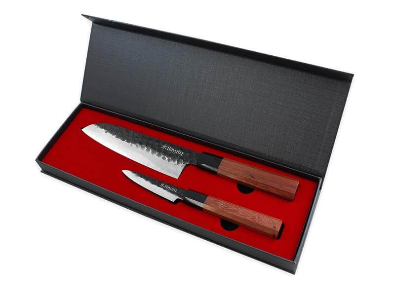 Sayuto Coffret Santoku Office. Coffret 2 couteaux SAYUTO Séquoia San Maï. Santoku pour trancher, émincer et ciseler, office pour émincer et éplucher fruits et légumes. Les couteaux Séquoia San Maï sont fabriqués en acier 10Cr15CoMoV avec une dureté Rockwell de 60 +/-1, finition « semi-brut ». Le manche poli est en bois de séquoia dur (d’où sa résistance à l’humidité et aux bactéries). La mitre est en corne de buffle noire. Ces couteaux ne vont pas au lave-vaisselle.