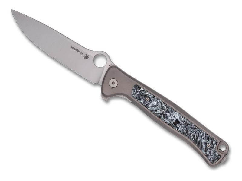 Spyderco Slym. Lame de 8.6cm en acier inox M390 Bohler finition stonewashed avec « flipper » amovible et à cran R.I.L., (frame lock en titane avec ajout d’acier sur le point de friction sur le talon de la lame), profil plat. Manche d’une pièce de 11,5 cm en titane avec revêtement PVD gris et insert fibre de carbone au recto. Clip de poche. Poids 96g. Produit en collaboration avec Lion Steel en Italie.