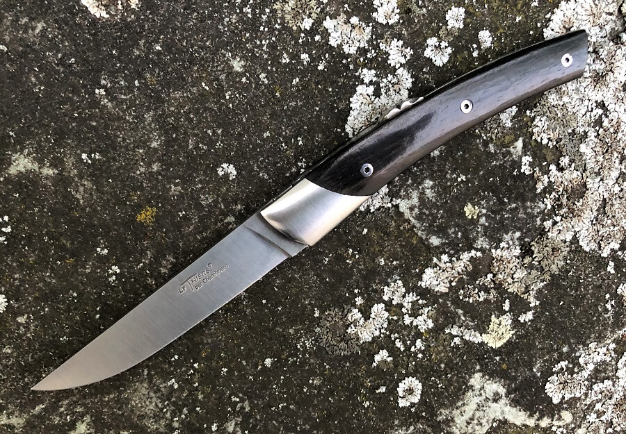 Couteau Thiers Chambriard Mi-Jo ébène. Lame en acier rasoir inox de 8.2cm. Manche avec mitres en inox satiné avec plaquettes en ébène. Ressort guilloché. Cran à pompe. Longueur totale 19cm. Un nouveau produit en 2019  par la coutellerie Chambriard.